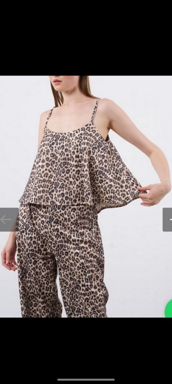 Kadınlar için askılı, kolsuz ve kısa boyda, bol kesim pijama takımıdır. Açık kahverengi leopar desenli, dökümlü tasarıma sahiptir ve yumuşak sentetik kumaştan üretilmiştir. Günlük rahat kullanım için uygundur.