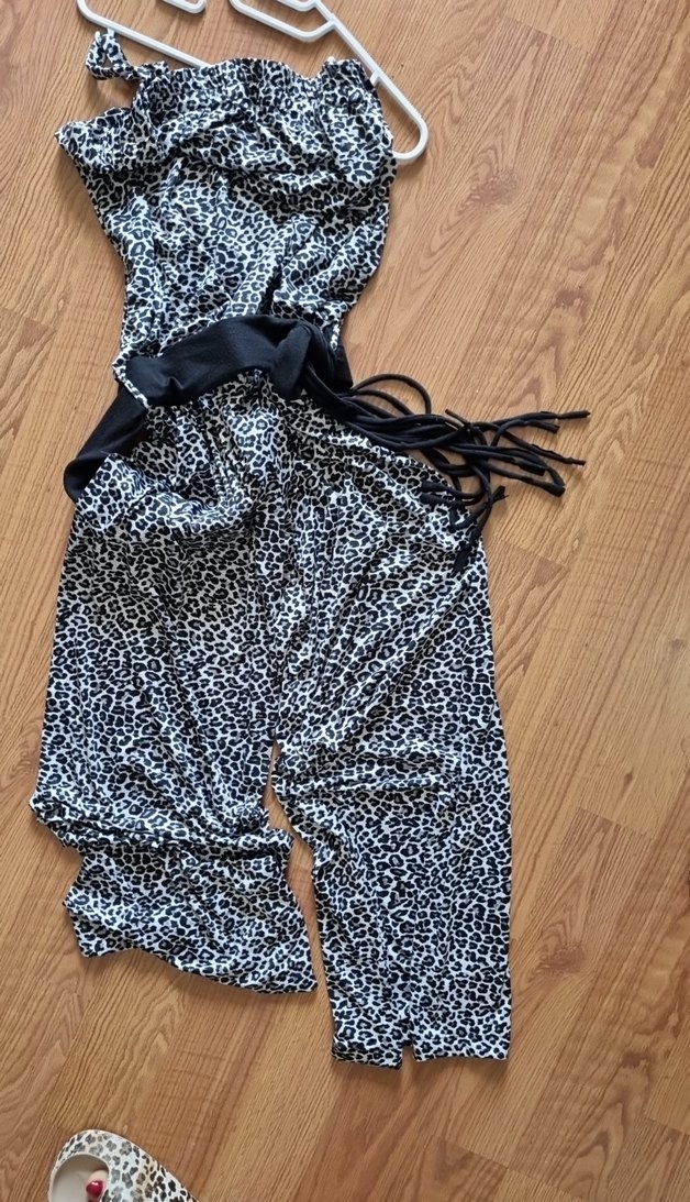 Gri leopar desenli, askılı, uzun ve beli kemerli hamile tulumu. Yumuşak sentetik kumaştan, sokak modasına uygun.