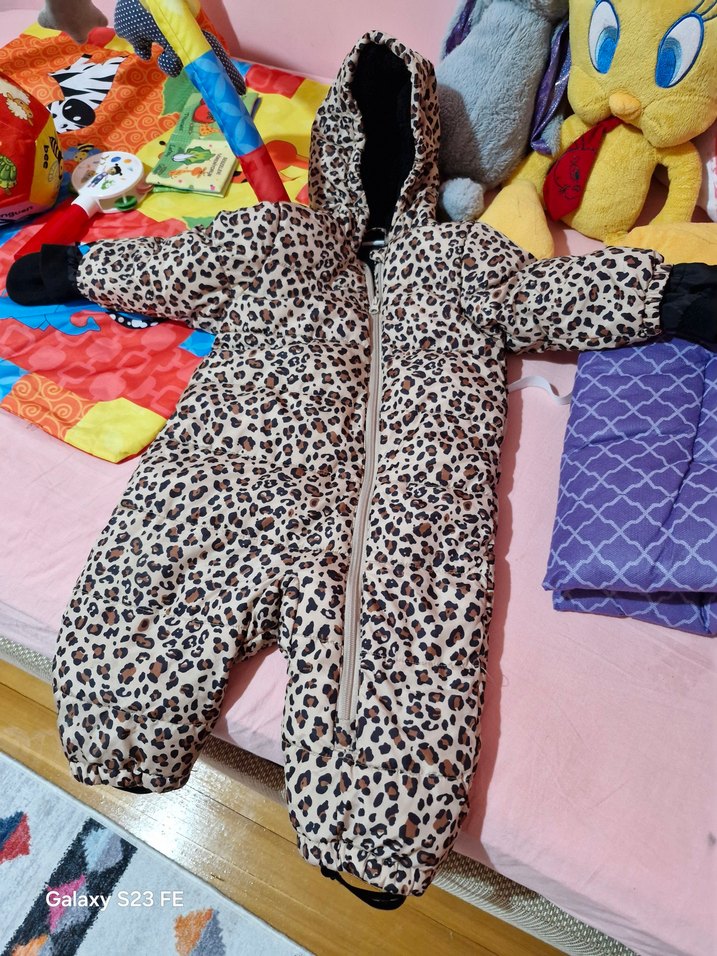 Kapüşonlu, kahverengi leopar desenli bebek tulumu, kürk detaylıdır ve sıcak tertemiz