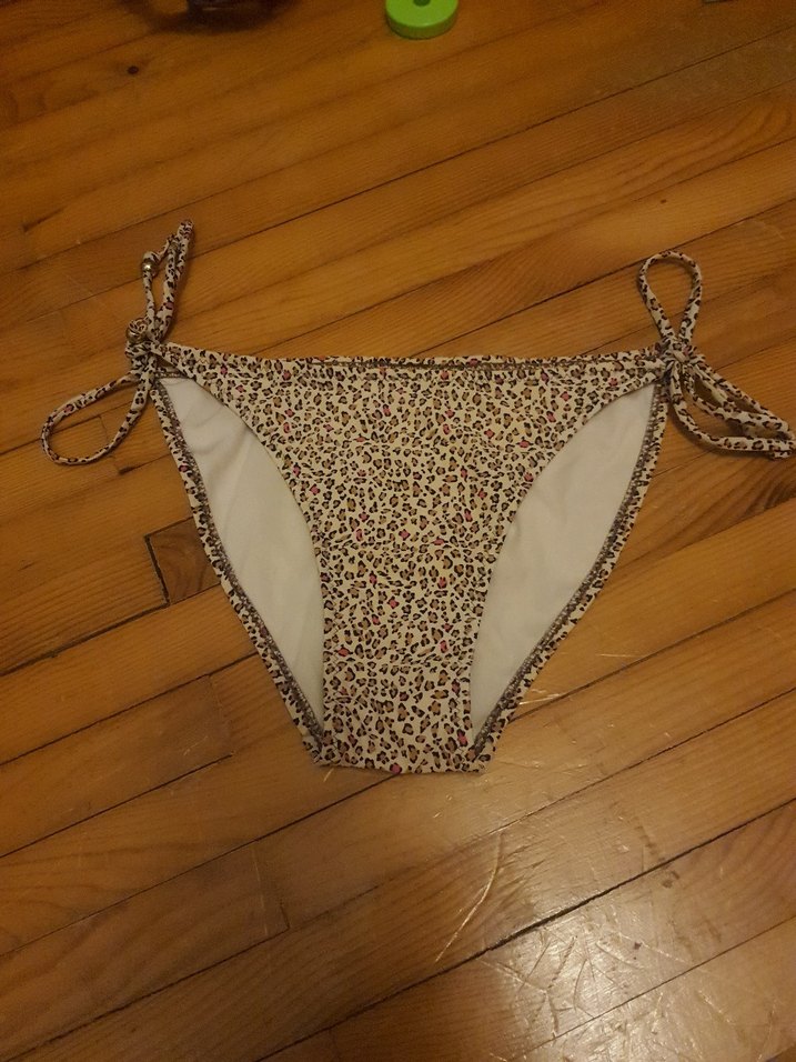 Bağcıklı ve leopar desenli bu bikini altı, bohem tarzıyla plajda şıklık sağlar. Hafif kahverengi tonlarda ve vücuda oturan kesimdedir.