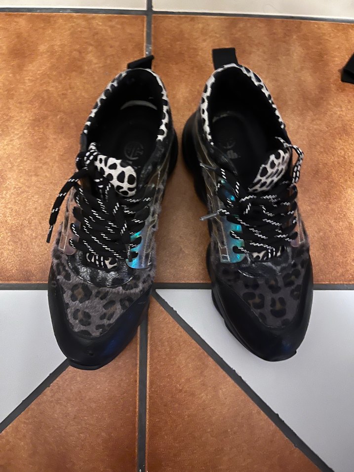 Leopar desenli, bağcıklı ve yüksek topuklu kadın spor ayakkabısı, sokak stili ve athleisure rahatlığını bir arada sunar. Elle marka