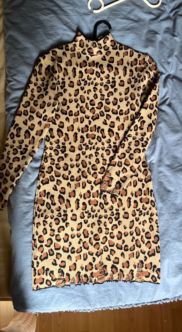 Kahverengi leopar desenli, balıkçı yaka, uzun kollu, vücuda oturan triko elbise. detaylarını çektim günlük kullanıma uygun esnek kumaşlı