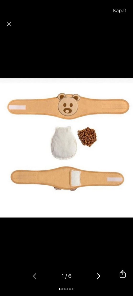 Yumuşak kumaşlı bej bebek bel ısıtıcısı, sevimli ayı tasarımlı. Doğal boncuk dolu çıkarılabilir torba içerir.