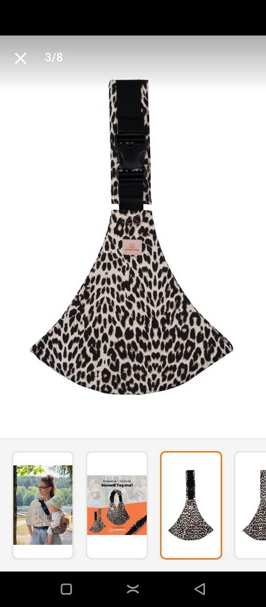 Koyu bej renginde, leopar desenli ve güvenli tokalı bebek taşıma slingidir. 20 kg kadar taşıyor