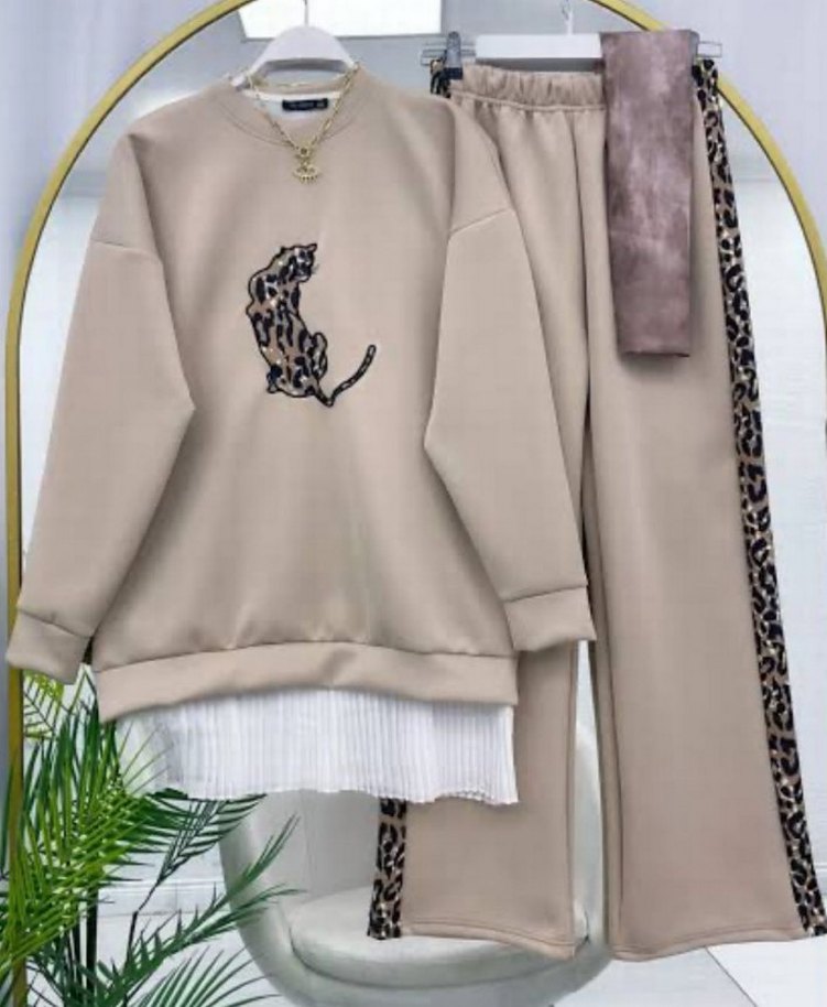 Leopar Desenli Bej Kadın Eşofman Takımı alt üst