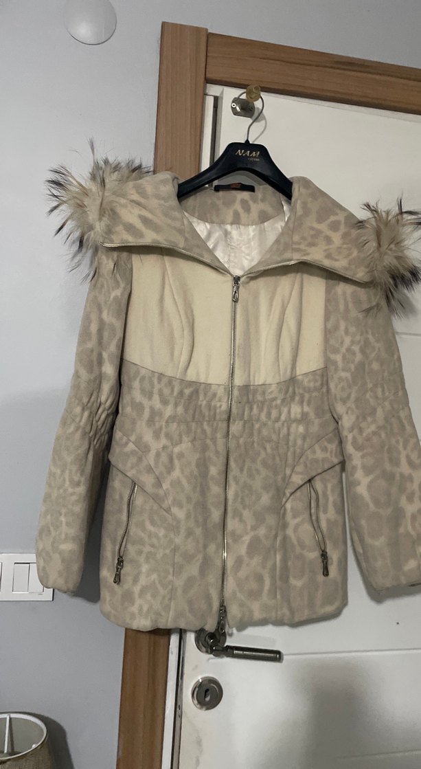 Bej renginde, leopar desenli, kürk detaylı kadın kışlık mont. Yumuşak kumaştan, uzun kollu ve belden oturan kesimdedir. Sokak modasına uygun midi boyda bir model. ❄️