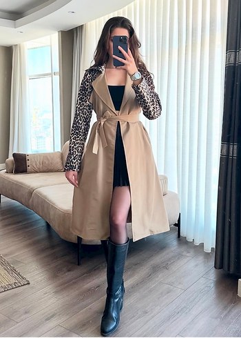 Yumuşak süet kumaştan yapılmış, leopar desenli kollu, kemerli uzun bej trençkot. Notlu yaka ve bol kesim özelliği ile rahat bir görünüm sunar.