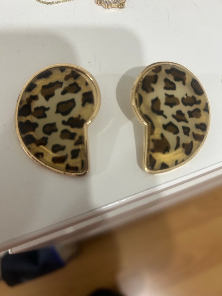 Parlak leopar desenli, düğmeli bej midi küpeler, vintage ve çağdaş tarzı bir araya getiriyor.