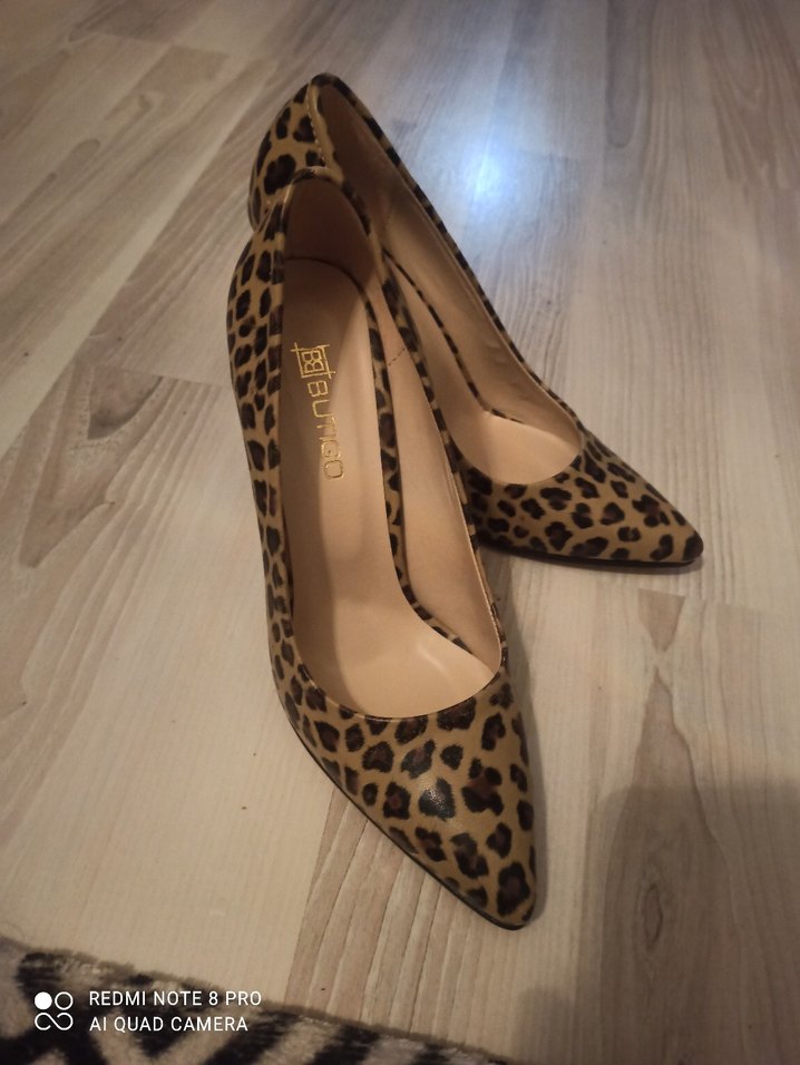 Bej süet malzemeden, leopar desenli ve kürk detaylı yüksek topuklu stiletto. Cesur ve çağdaş Paris tarzını yansıtır, romantik akşamlar için uygun.