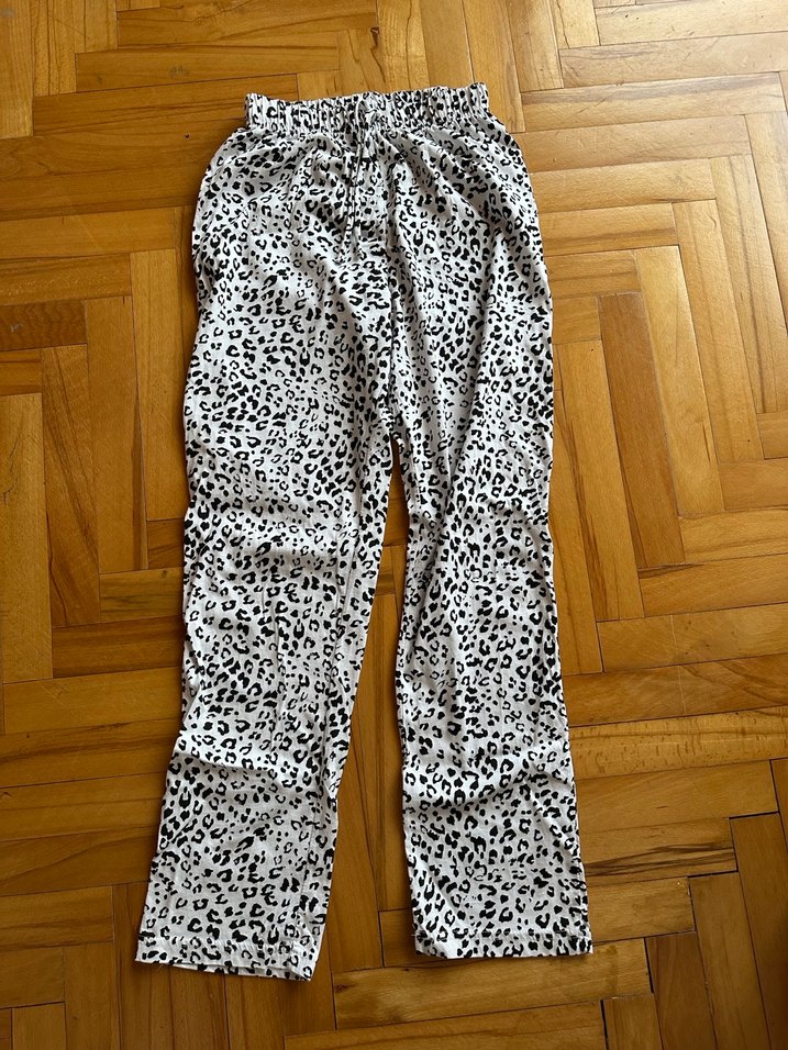 Leopar desenli, beli bağcıklı, bol kesim kadın pijama. Gri ve kahverengi tonlarında, midi boy, rahat ve şık bir sokak tarzı ürünü.