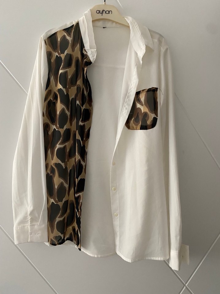 Kadınlar için uzun kollu, yakalı ve düğmeli beyaz gömlek. Bir tarafı ve gömlek cebinde koyu leopar desenli, rahat ve salaş kesimli. Etiketini kesmişim s beden olmalı
