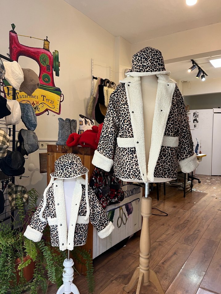 Leopar Desenli Beyaz Kürklü Kız Mont