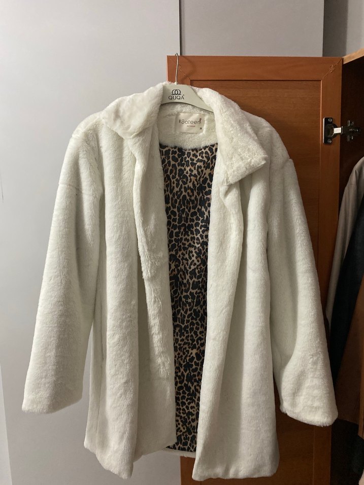 Leopar desenli iç astarlı, beyaz peluş ve uzun kollu, normal boy bol kesim ceket. Rahat ve sokak stiline uygun.