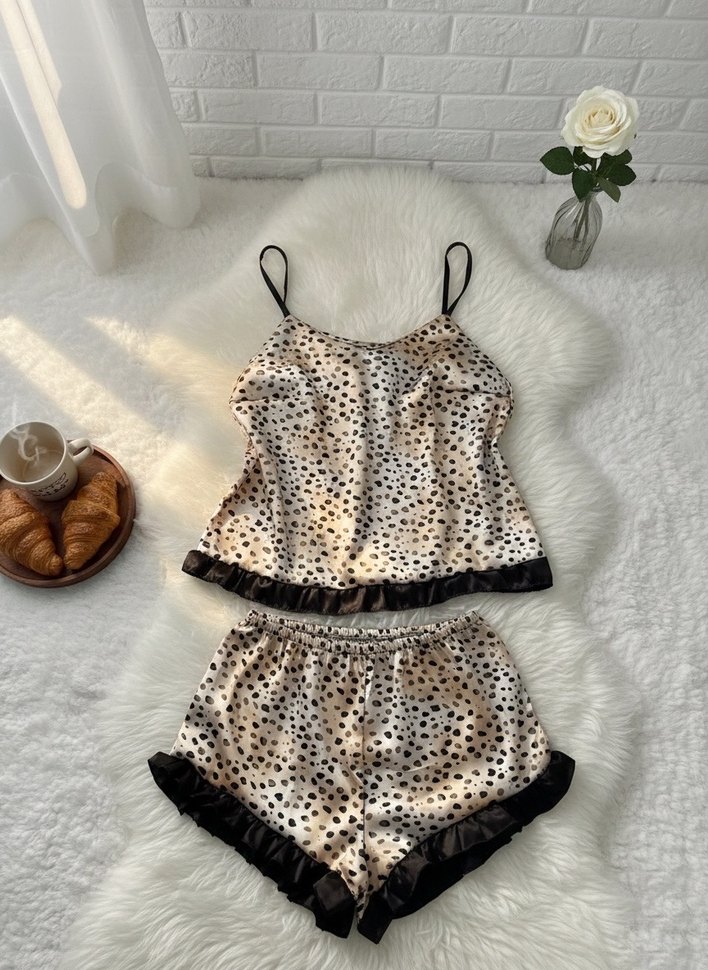 Kadın pijama takımı, leopar desenli beyaz ip askılı üst ve şortlardan oluşur, siyah fırfır detaylı ve rahat kesimlidir.