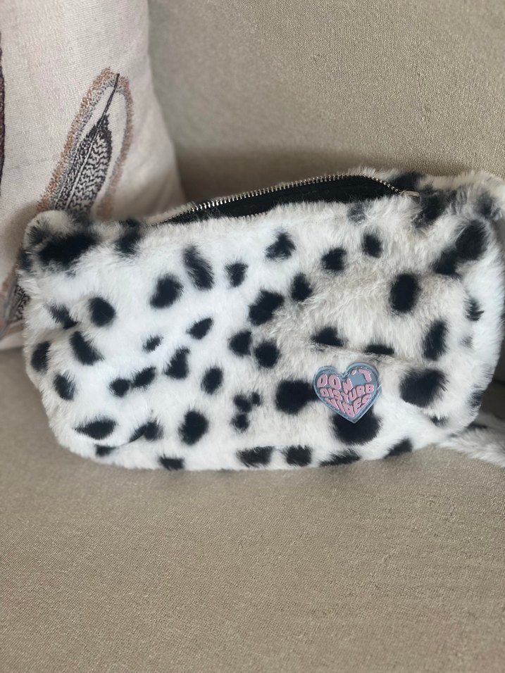 Beyaz renkli, leopar desenli ve peluş detaylı kadın çantası. Bohem ve retro tarzıyla günlük kullanıma uygun, rahat bir sokak giyimi parçası.