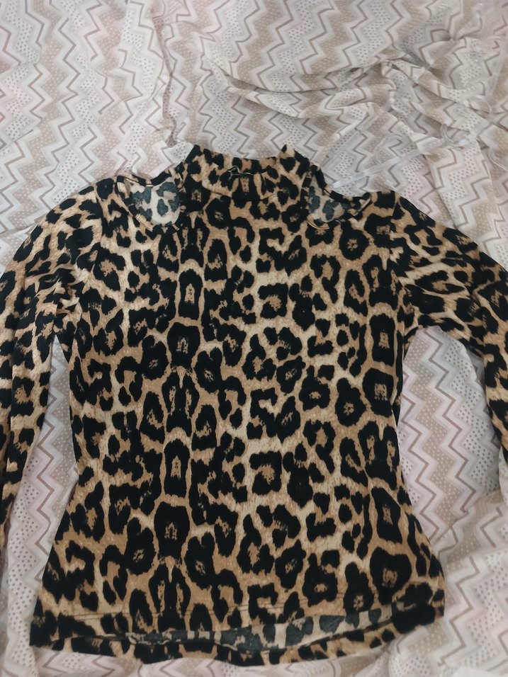 Dar kesim, uzun kollu ve boğazlı kadın bluz, yumuşak sentetik kumaş üzerine koyu kahverengi leopar desenlidir. Dantel detaylarıyla rahat ve bohem bir tarza sahiptir.