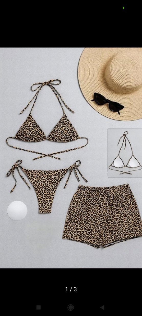 Leopar desenli, bağcıklı mini bikini üstü, bağcıklı alt ve rahat kesim şort içeren bohem tarzda plaj takımı. Rahat ve şık tasarım.