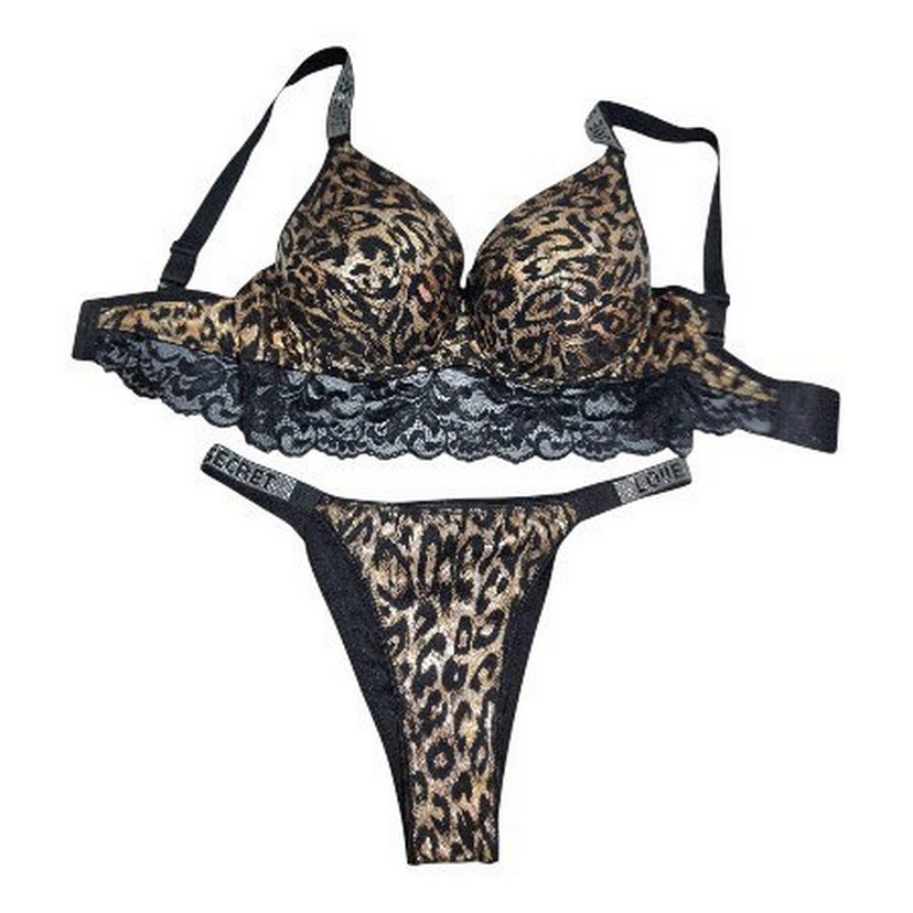 Koyu kahverengi leopar desenli, siyah dantel detaylı sütyen ve tanga takımı. Ayarlanabilir askılı, midi uzunlukta dantel bandı ile bohem ve şık tarz sunar.