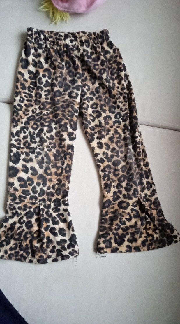 Leopar desenli, bol kesim uzun cocuk kumaş pantolon. Yumuşak sentetik kumaştan, kahverengi tonlarda, fırfır detaylıdır. Bohem tarzda, dış mekan sokak giyimi için uygundur.