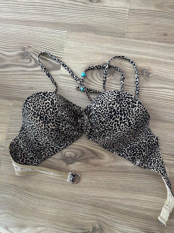 Deri tonlarında leopar desenli, boncuklu detaylara sahip, bohem tarzda ve ince askılı, dış mekan kullanımı için uygun bikini üstü.