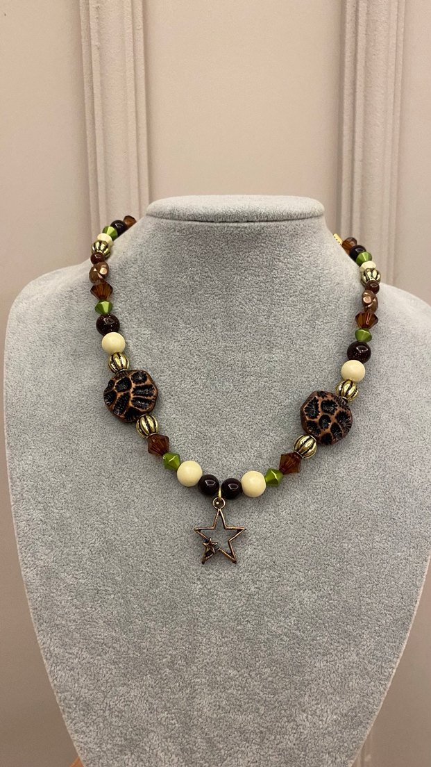 Leopar desenli boncuklar ve yıldız kolye ucu içeren uzun kahverengi bohem kolye.