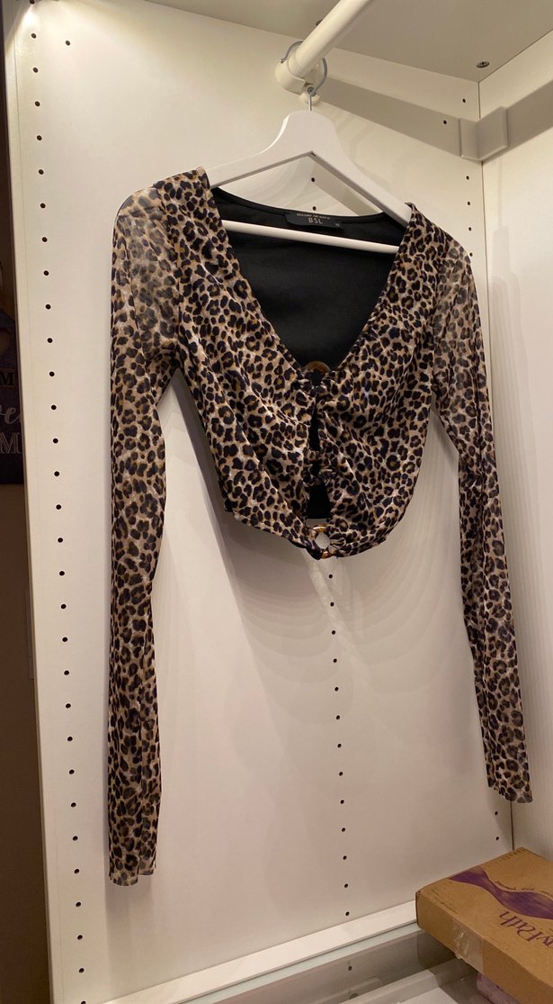 Bsl Leopar desenli, V yaka, düğmeli, uzun kollu, normal uzunlukta, vücuda oturan kadın bluz. Xs beden hiç giyilmedi sıfır temiz
