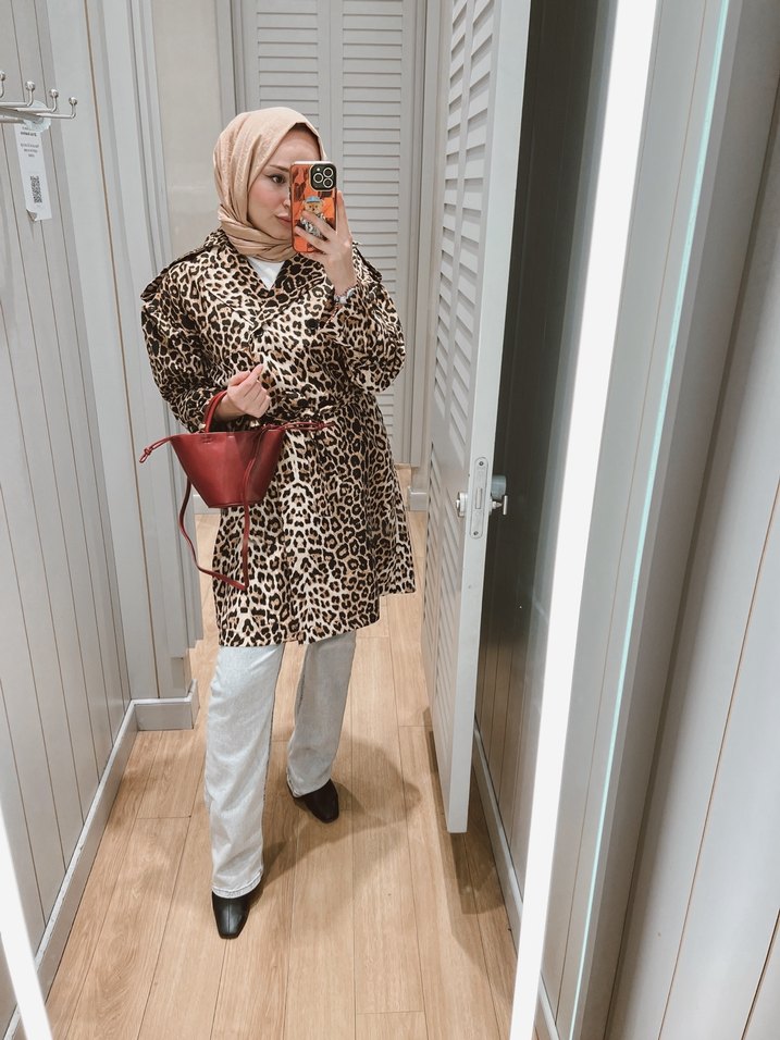 Leopar desenli, kemerli ve bol kesim camel midi kaban. Uzun kollu ve kesikli yakalı, sentetik kumaştan üretilmiştir.