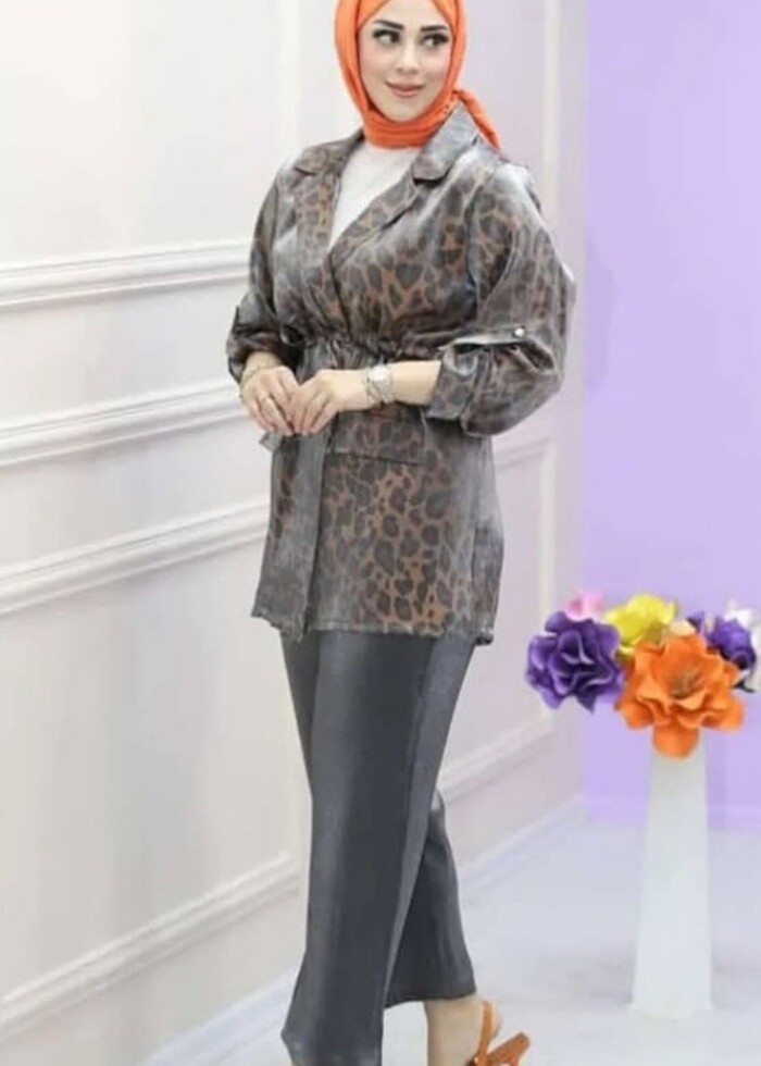 Leopar desenli ceketli ikili takım