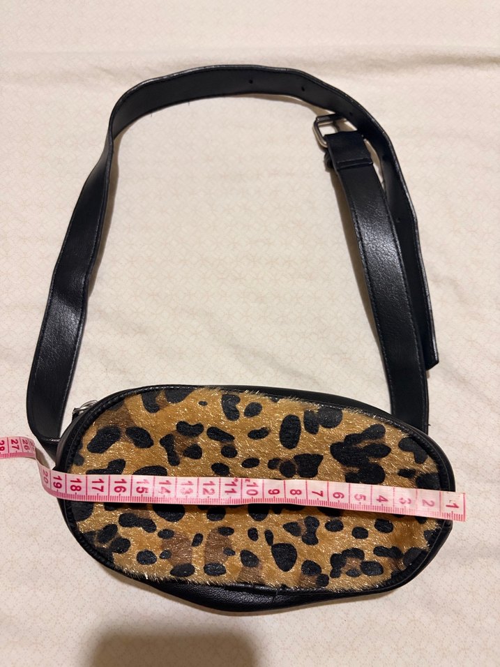 Kahverengi deri, leopar desenli ve kemerli tasarıma sahip kadın çapraz çanta, günlük sokak stiline şık bir dokunuş katıyor.