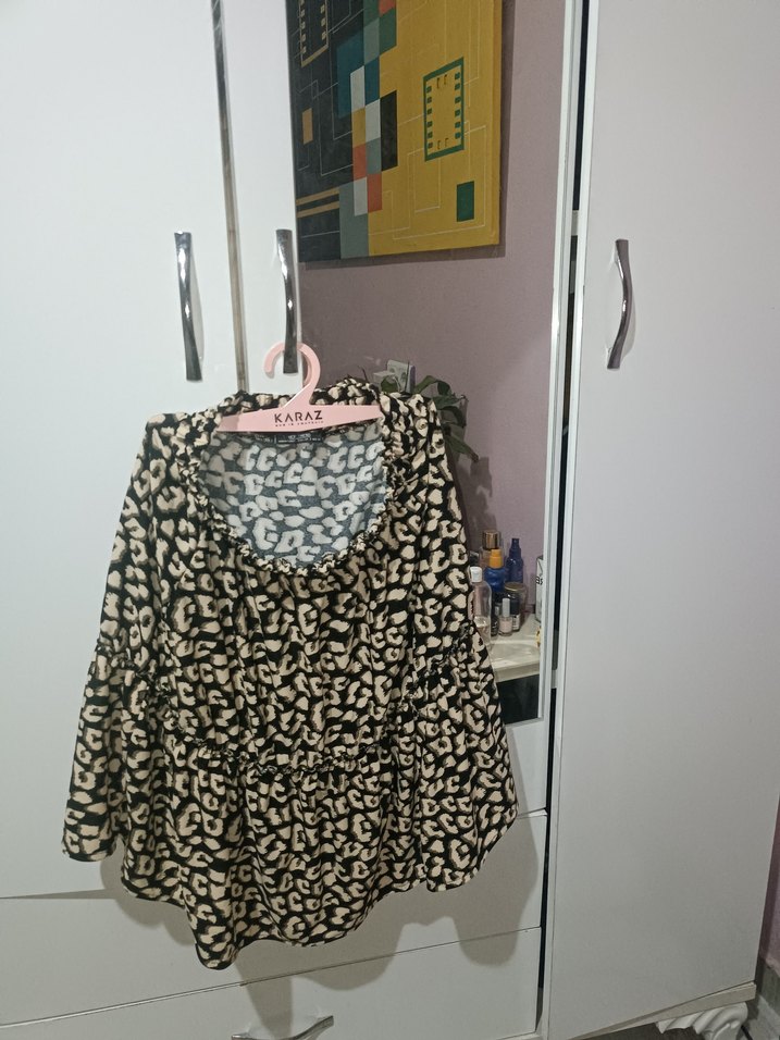 diz üstü, fırfırlı detaylı bol kesimahverengi bej ve siyah desenli kadın etek. Rahat sentetik kumaştan, günlük sokak stiline uygun.