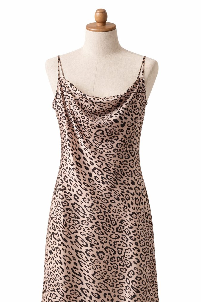 Bej renkli, ince askılı, drapeli detaylara sahip leopar desenli mini elbise. Fitted kesimi ve kayık yaka ile cesur, modern bir tarz sunar.
