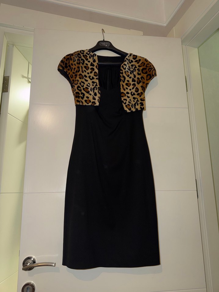 Siyah, straplez ve kolsuz, leopar desenli drapeli detaylarla klasik gotik tarzı yansıtan uzun, dar kesim elbise. Ofis için uygun.