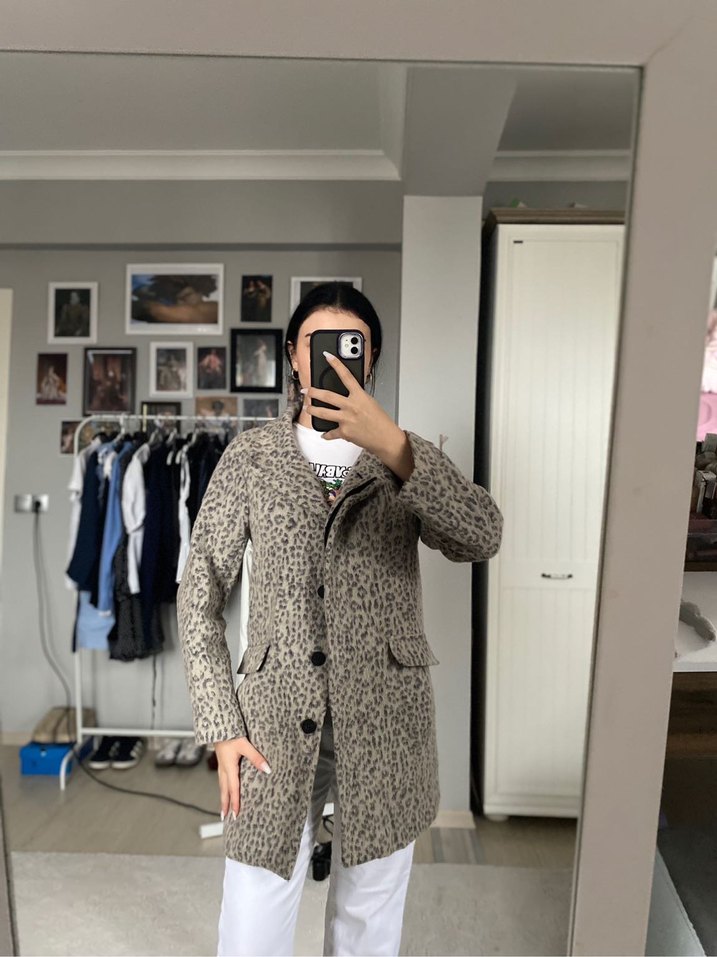 Leopar Desenli Düğmeli Kaban