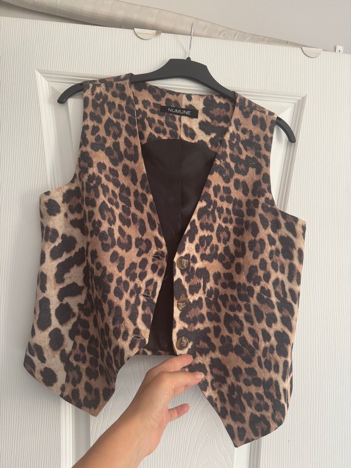 Düğmeli, V yaka, leopar desenli, sentetik kumaştan yapılmış, kadınlar için fitted kesim kolsuz yelek.
