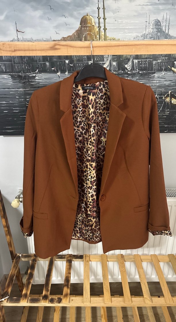 Kahverengi kadın blazer, yakası kırmalı, uzun kollu ve düğmeli. Parlak leopar desenli astarı ve normal kesimiyle ofis için uygun, sentetik kumaştan yapıldı. Ufak bi ip çekmesi var o kadar