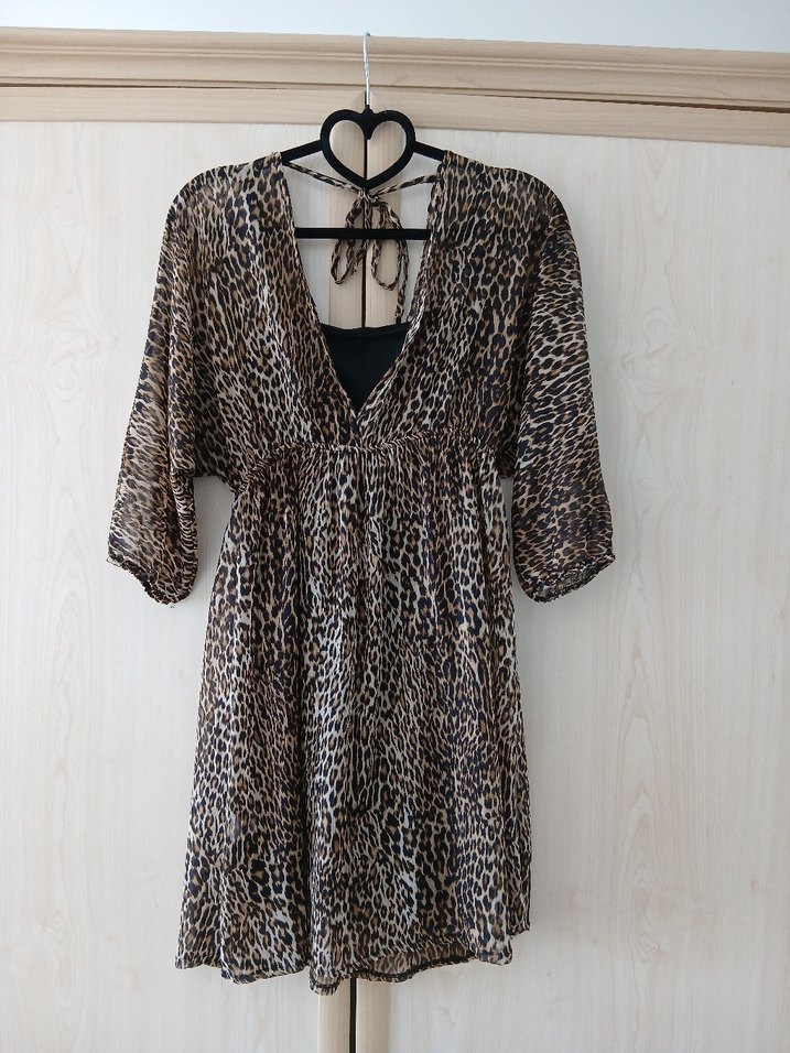 , leopar desenli, V yaka, drapeli, salaş kesim elbise. Kahverengi tonlarda, astarlı ve midi boyu ile yumuşak sentetik kumaştan.