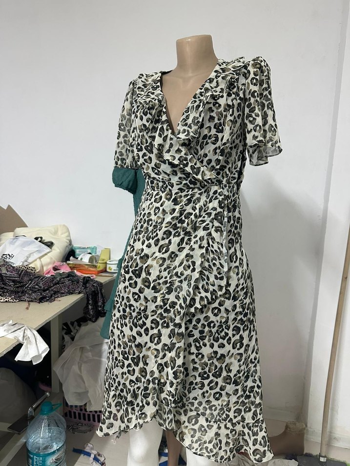 Leopar desenli fırfırlı v yaka uzun elbise içinde astarı bulunuyor alt kesimi çok güzel kısa kollu s-m olur