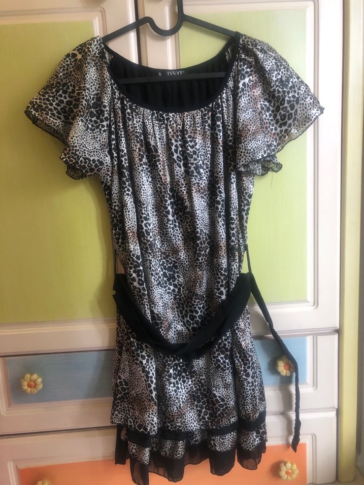 Saten kumaştan, leopar desenli, kısa boylu, geniş yaka, geniş kesim mini elbise. Kemer detaylı, günlük ve gece kullanıma uygun.