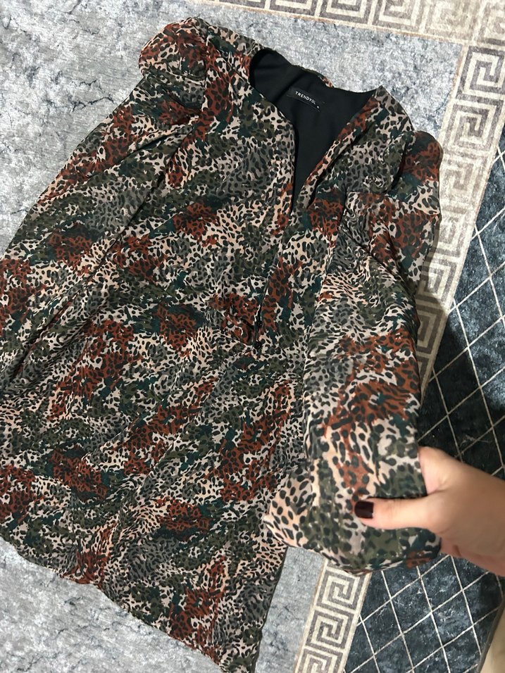 Leopar desenli, sentetik kumaştan elbise . V yaka, uzun kollu ve fermuarlı, rahat kesim. Günlük kullanıma uygun koyu kahverengi tonlarında.