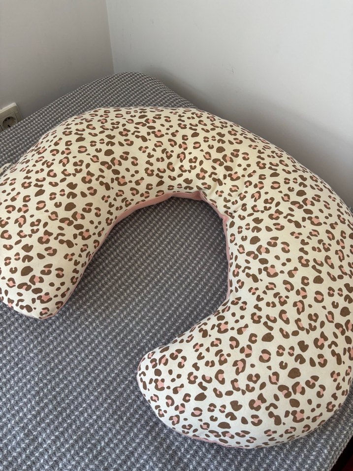 Leopar desenli kahverengi kılıfa ve gri tabana sahip hamilelik ve emzirme yastığıdır, rahat destek sunar.