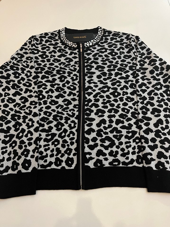 Leopar Desenli Fermuarlı Siyah Kadın Ceket