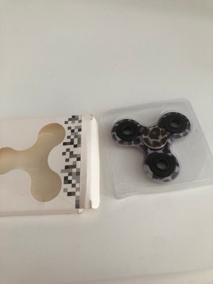 Üç kollu, siyah rulmanlı ve leopar desenli koyu renkli fidget spinner, şeffaf plastik kutuda.