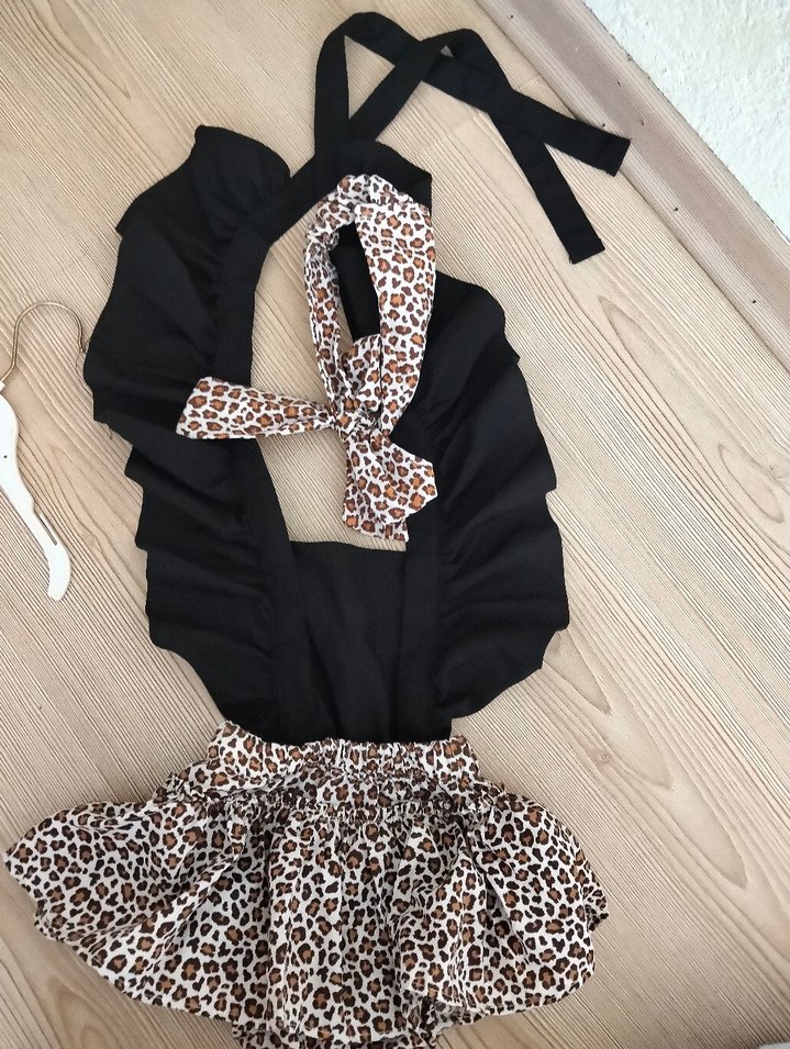 Koyu kahverengi, leopar desenli ve fırfırlı bebek tulumu. Askılı ve lastikli bel detaylarıyla rahat kullanım sağlar.