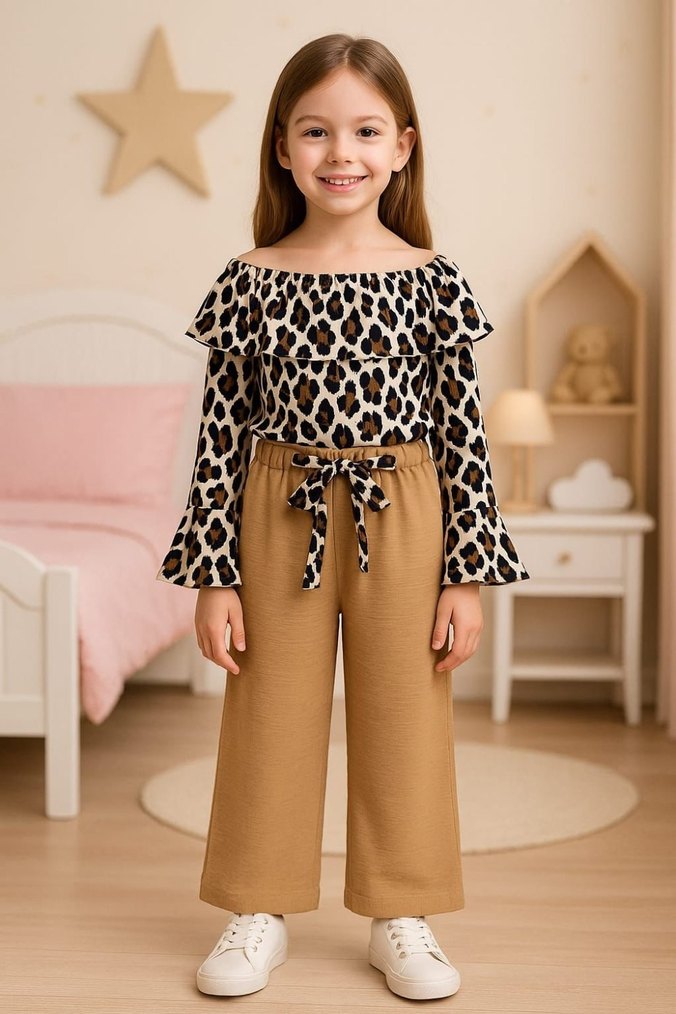 Leopar desenli, fırfırlı ve kayık yakalı uzun kollu bluz ile bağcıklı, bol kesim açık kahverengi pantolon takımı.