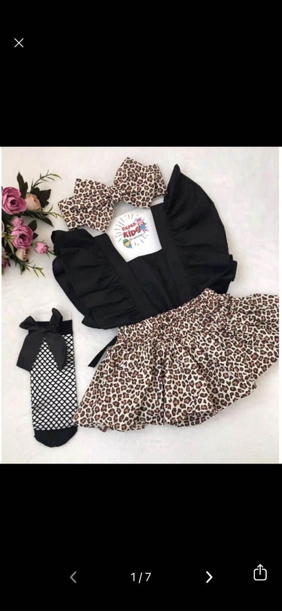 Koyu kahverengi fırfırlı askılı üst ve leopar desenli etekten oluşan kız bebek takımı. Takımda leopar desenli saç bantları ve fiyonk da bulunur.