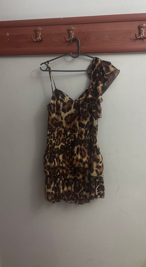 Bu dar kesim mini elbise, straplez yakası ve fırfır detayları ile cesur leopar desenine sahip. Koyu kahverengi tonlarında sentetik kumaştan üretilmiştir.