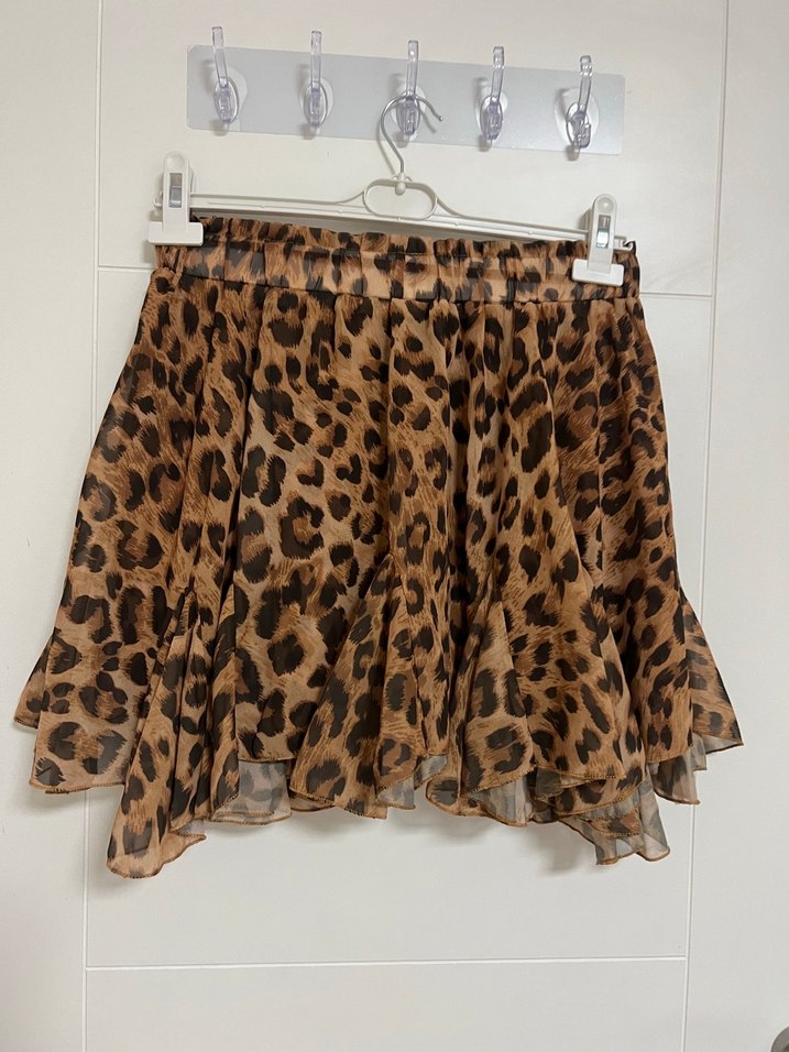 Sentetik kumaştan, leopar desenli koyu kahverengi, bol kesim fırfırlı mini etek. Günlük sokak stili için uygun, bohem esintili. Şortludur . Hiç kullanmadım yıkamak için etiketini söktüm