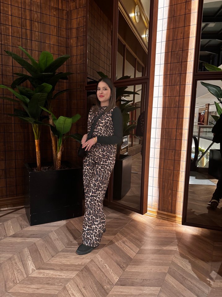 leopar desenli, fırfırlı ve askısız yakalı, sentetik kumaştan yapılmış, salaş kesim kahverengi yelek. Ürün alt üst takımdır S bedendir