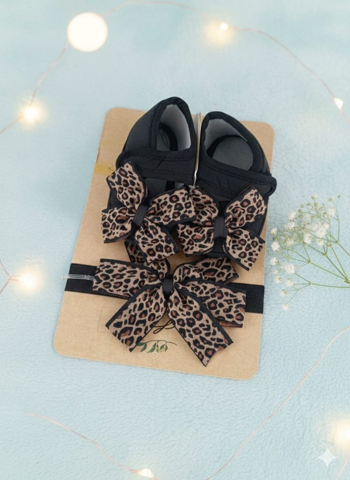 Leopar Desenli Fiyonk Detaylı Patik Ve Saç Bandı