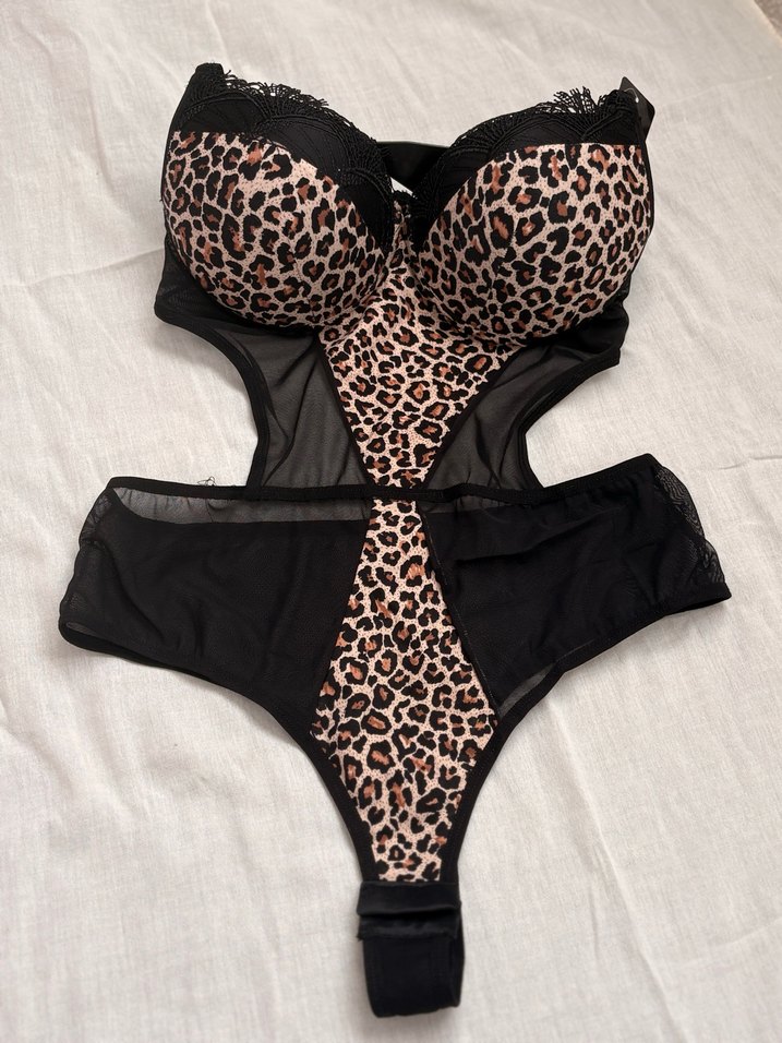 Leopar desenli koyu kahverengi, şeffaf siyah tül detaylı, parlak ve gotik tarzda göğüs korsesi.